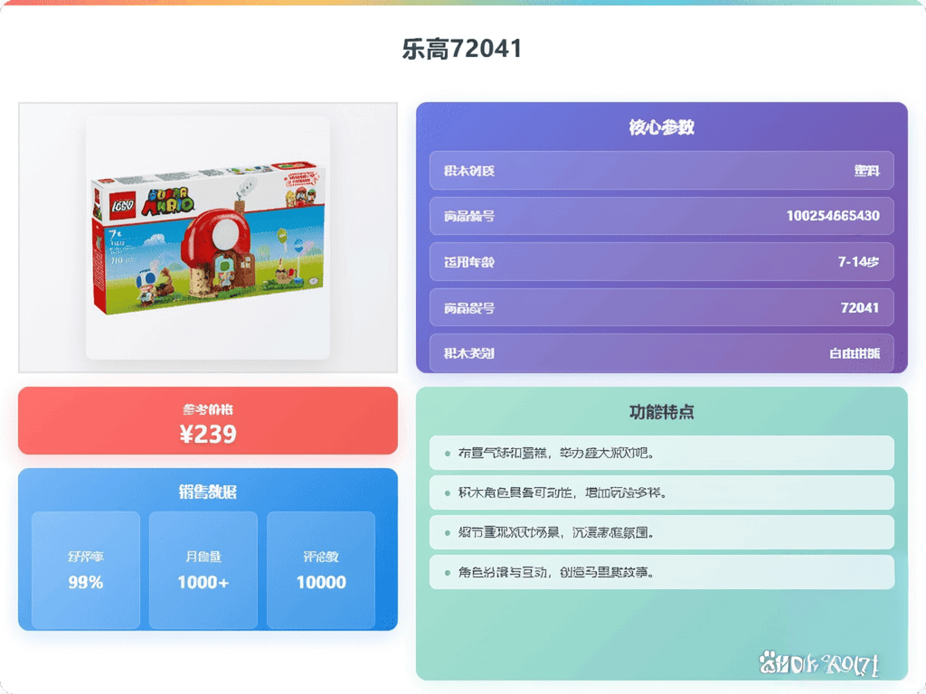 在挑选马里奥玩具时,首先要关注的是还原度!毕竟我们购买的是情怀,对不对?像乐高这些,尽量选择角色造型精致、场景搭建丰富的。例如,乐高72041能够拼出奇诺比奥的小屋,孩子可以自己创造马里奥故事,这比单纯的积木要好玩得多!还有乐高72044,经典场景还原,角色丰富,马里奥、路易吉、碧姬公主全都有,孩子肯定会喜欢。